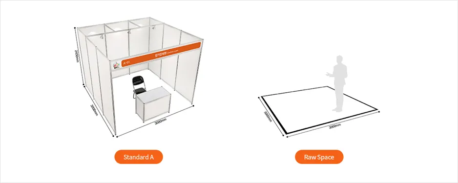 Standard A | 3m X 3m X 2.5m | Fascia board, lighting, 1 Electrical outlet 1 Information desk & chairs | $ 2,400 |